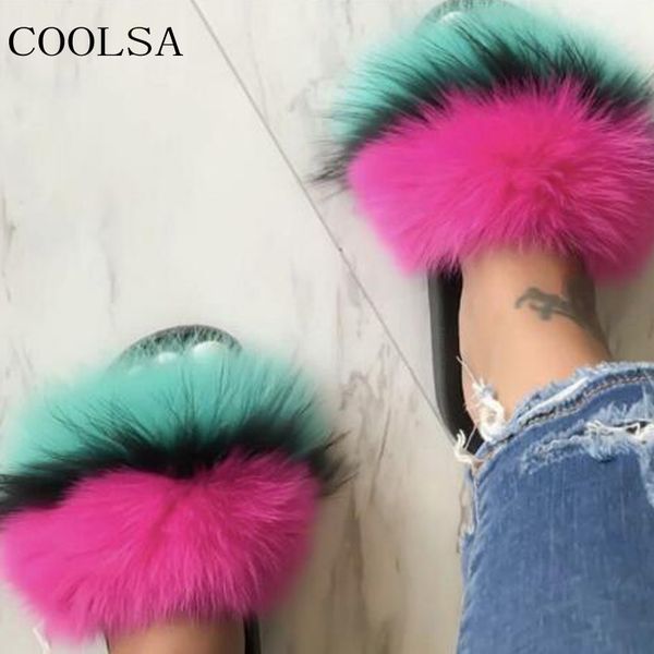 winter women's plush slippers indoor furry home shoes warm fox fur slippers women fur slides flip flops female fluffy sandals 45 x1020, Black