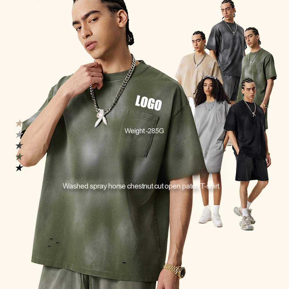 Custom LOGO men's 2025 summer 285G retro spray horse Liu small worn T-shirt double yarn fabric 100% cotton hole short sleeve