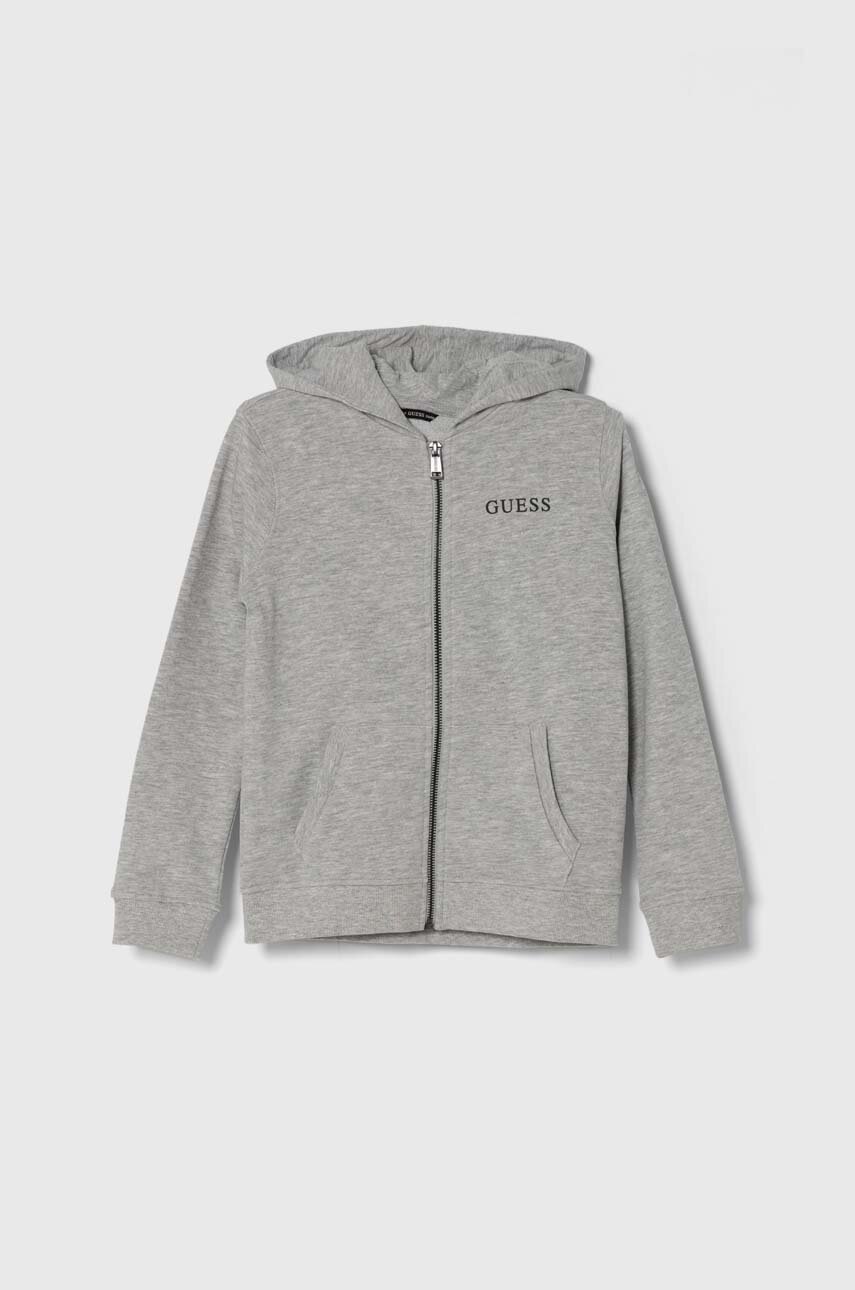 Детская хлопковая кофта Guess цвет серый с капюшоном с принтом