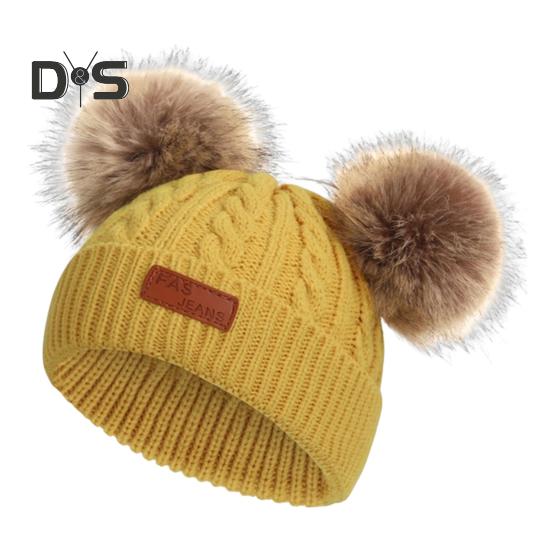 Детская шапка-бини осень-зима вязаная шапка с 2 помпонами для мальчиков и девочек 1-4 лет теплая шапка-бини для малышей для активного отдыха на свежем воздухе жёлтый