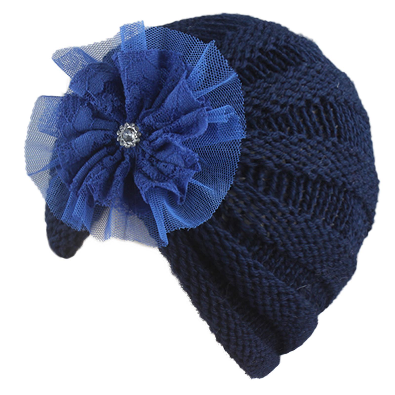 Детская шерстяная теплая шапка Осенне-зимняя вязаная шапка с цветами тёмно-синий