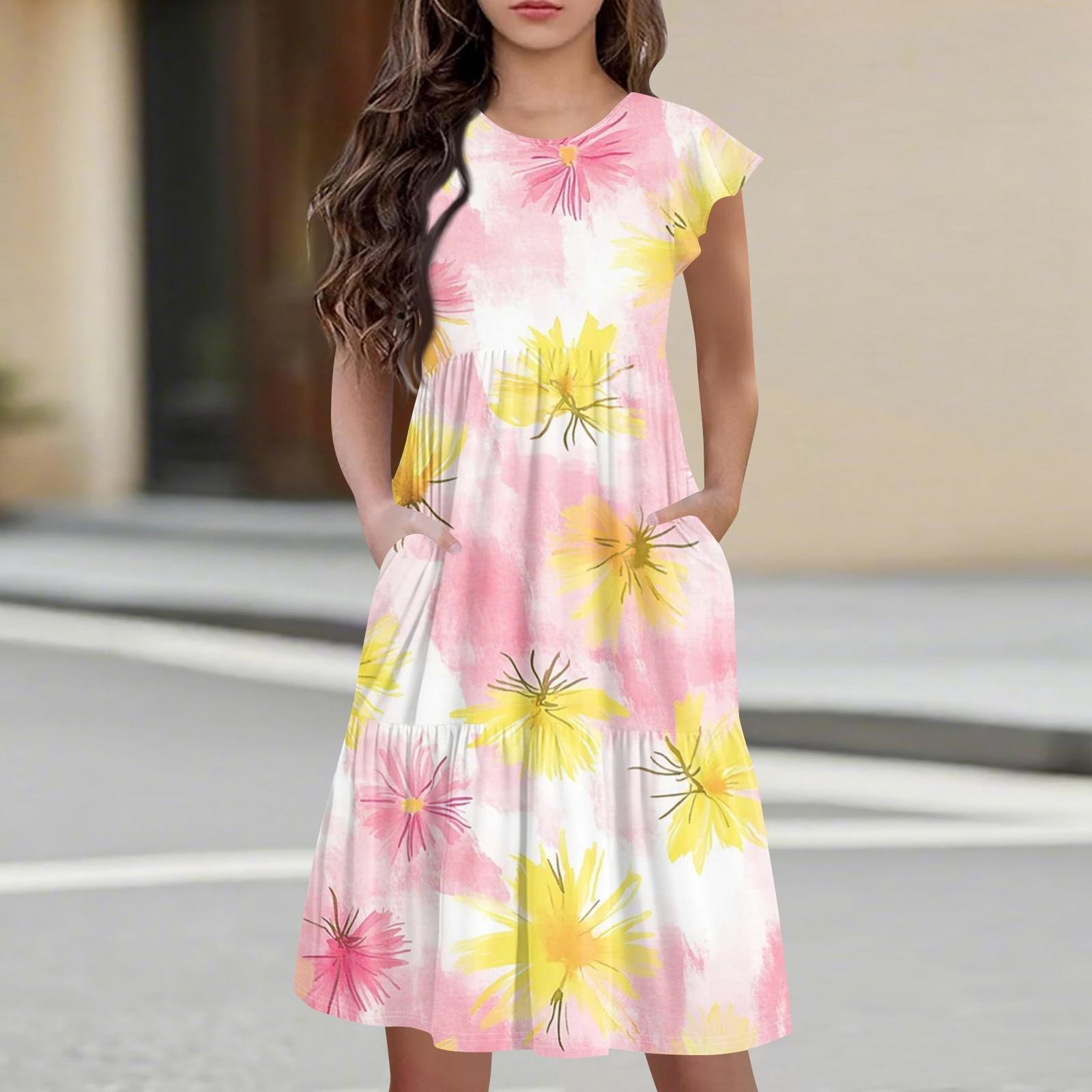 Детская юбка с круглым вырезом, плиссированная, с коротким рукавом, юбка принцессы, модное повседневное платье с карманами для девочек 100 розовый