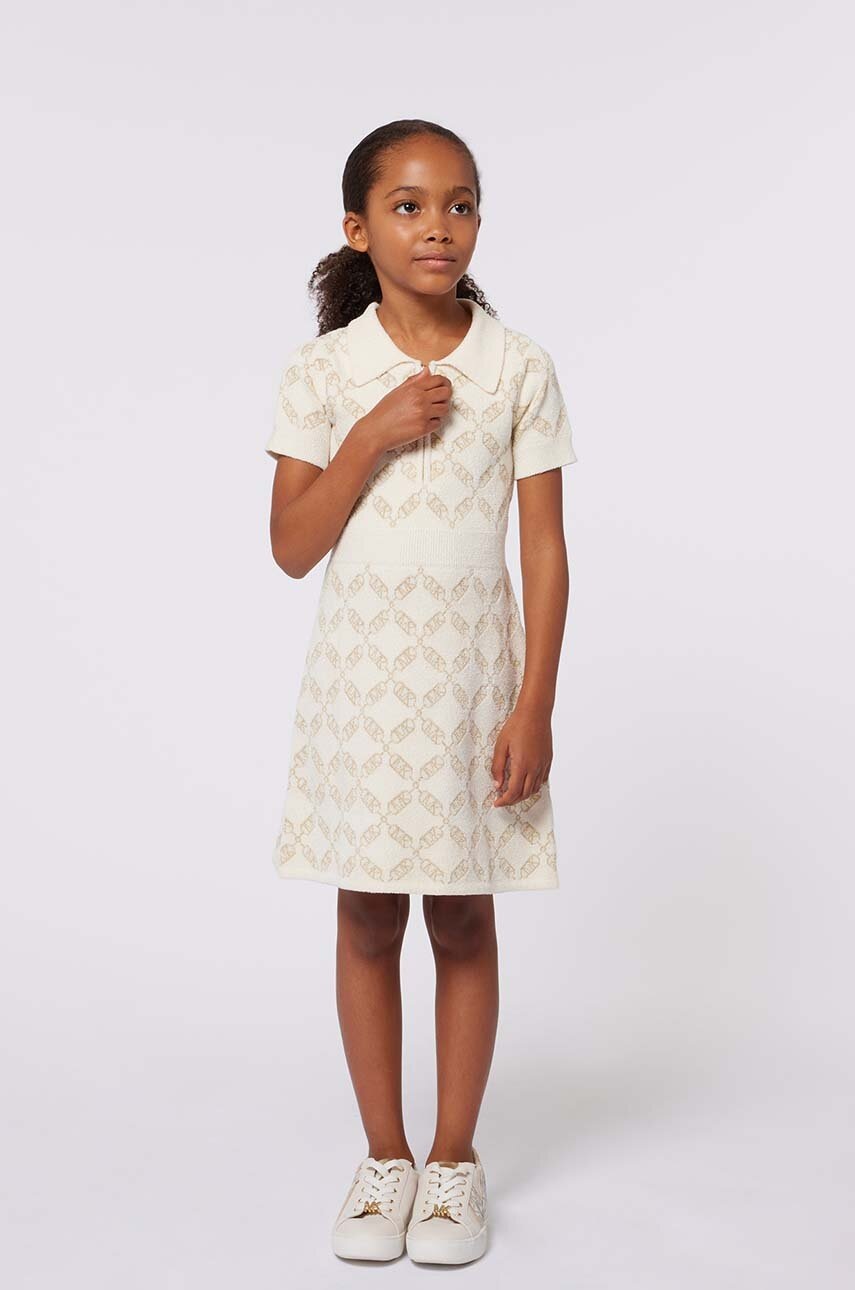 Рокля за деца от Michael Kors. Моделът е направен от трикотаж с шарки.- Стандартна, неблокираща кройка.- Къси ръкави.- Яка.- Цепка с цип.