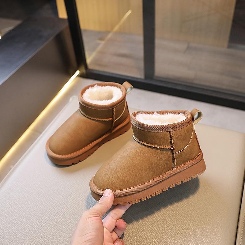 Детские кожаные зимние ботинки для девочек, водонепроницаемые короткие ботинки для мальчиков, утепленные толстым плюшем, зимние ботинки, теплая хлопковая обувь 34 коричневый