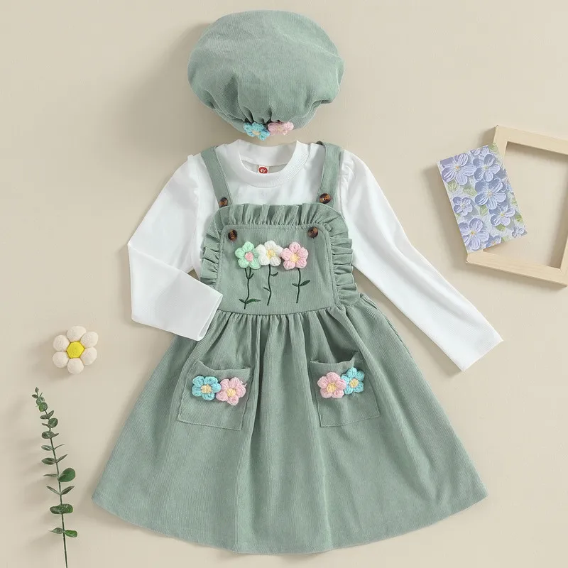 Детские комплекты мини-платьев для девочек, весенне-осенняя одежда, детская рубашка в рубчик с длинным рукавом и 3D цветочным узором, юбка на бретелях, комплект с шапкой