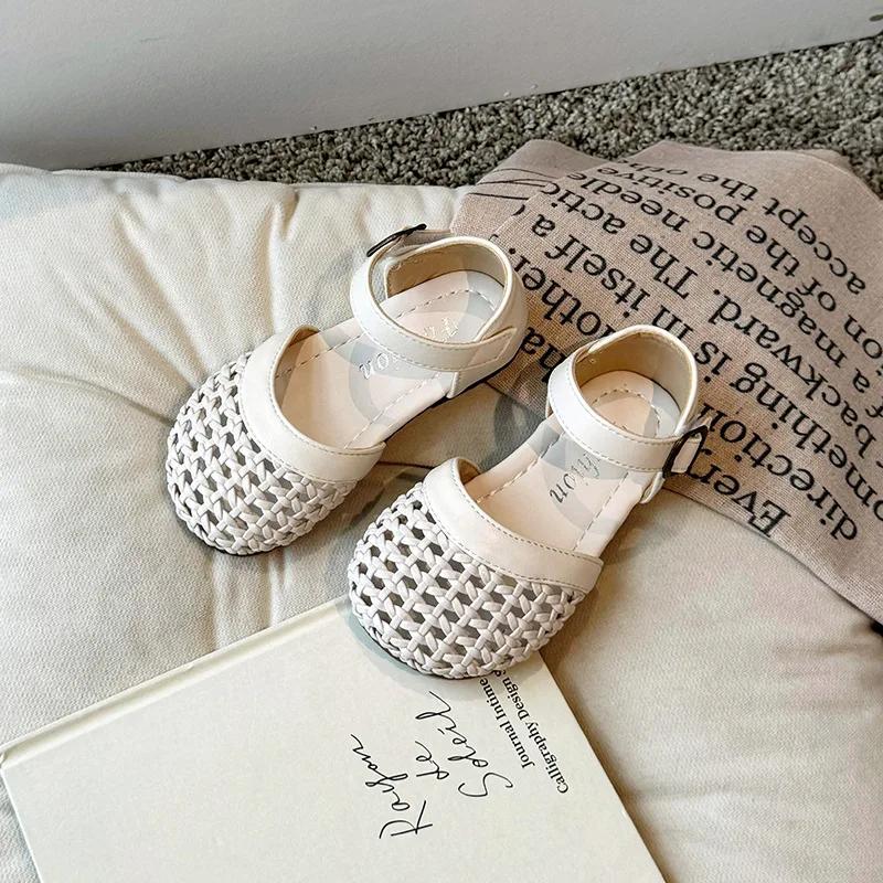 Детские летние туфли принцессы с полым плетением для девочек, сандалии однотонные 2024, новые детские пляжные туфли для отпуска, мягкая подошва 23 бежевый
