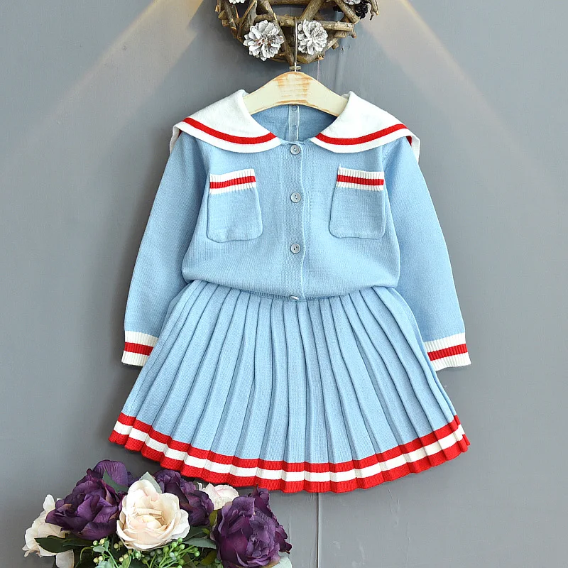 Детские платья для девочек, Модный вязаный пуловер + платье, детские костюмы, матросский воротник, одежда с длинным рукавом для девочек, мила...