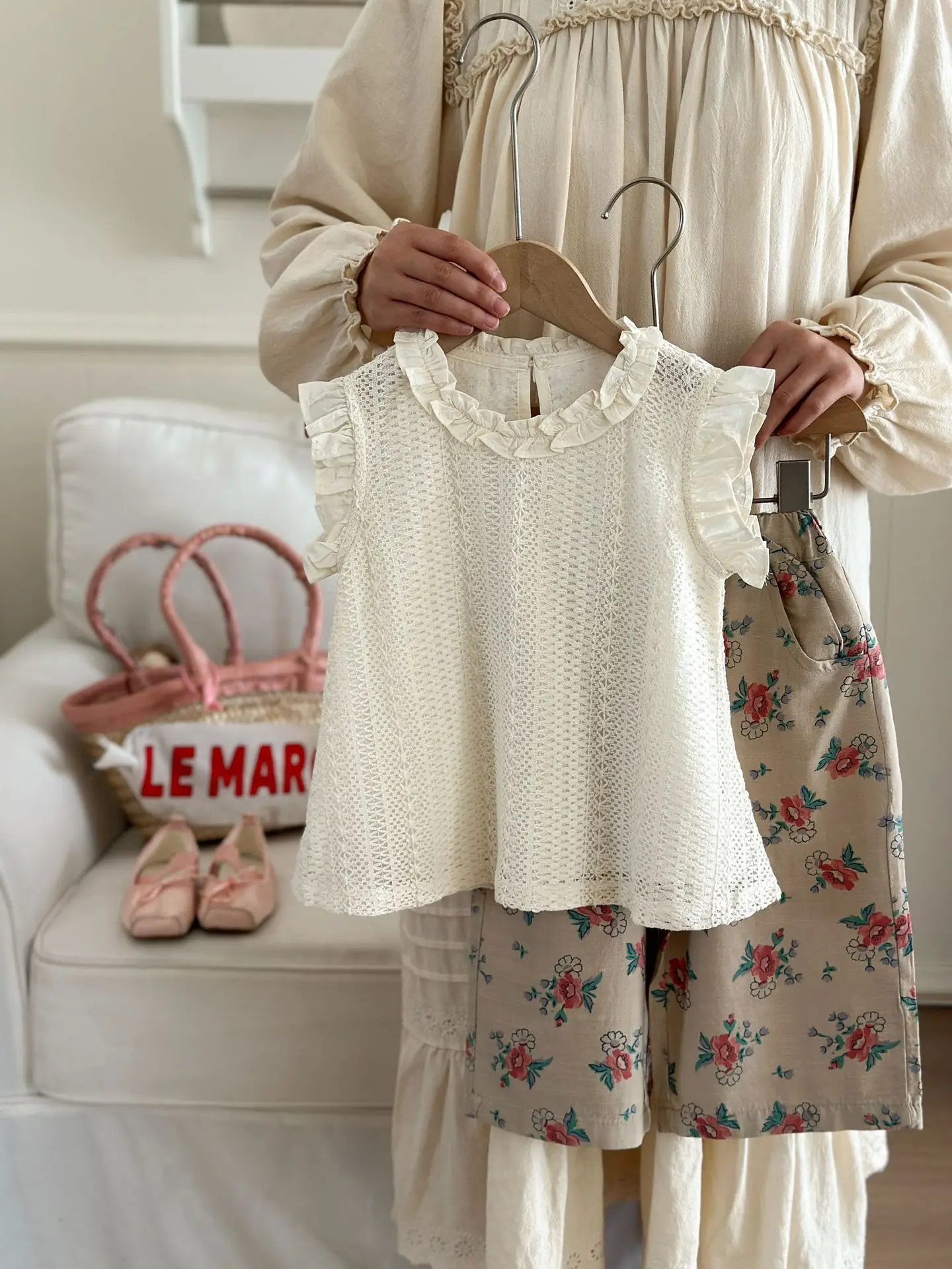 Детские топы, блузки для девочек, Новинка лета 2024, хлопковые кружевные рубашки без рукавов для девочек с куклой, детская одежда 2-8 лет