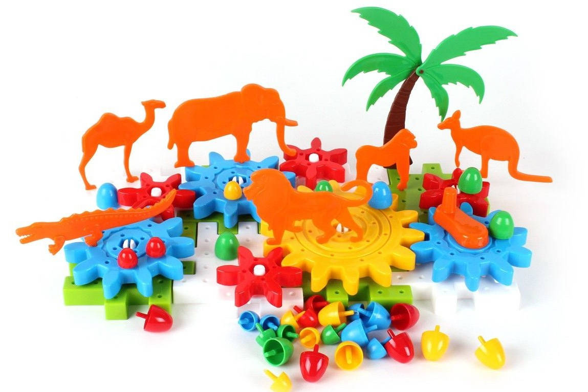 Конструктор состоит из 66 ярких деталей, которые идеально сочетаются между собой. Шестерни, пластины-пазлы, фигурки зверей, пальма и другие оригинальные элементы конструктора вызывают настоящий восторг у детей и взрослых. Все детали конструктора изготовлены из качественной пластмассы, без запаха и вредных составляющих. Продается конструктор в специальном прочном пакете.