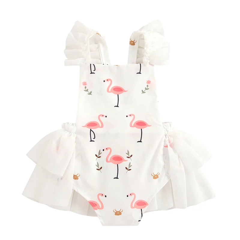 Детский комбинезон с высокой талией, летний кружевной комбинезон с рукавами «Фламинго», для детей 0-24 месяцев