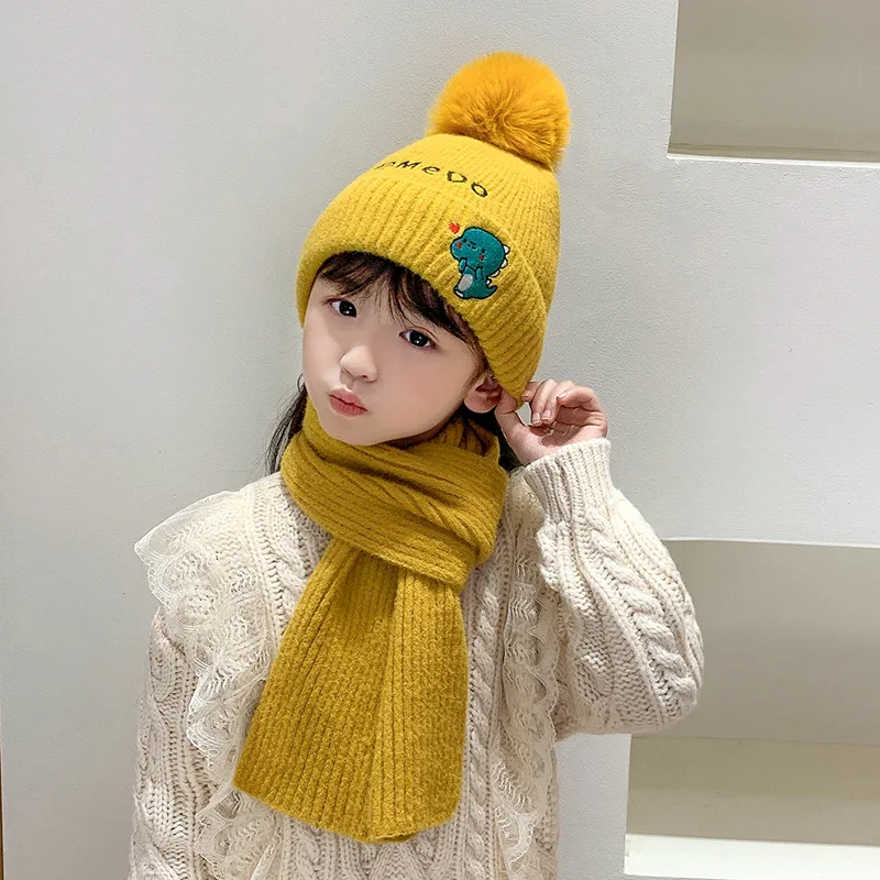 Детский комплект из шапки и шарфа для маленьких мальчиков и девочек, теплая вязаная Милая шапочка с вышивкой динозавра и помпоном, комплект ...