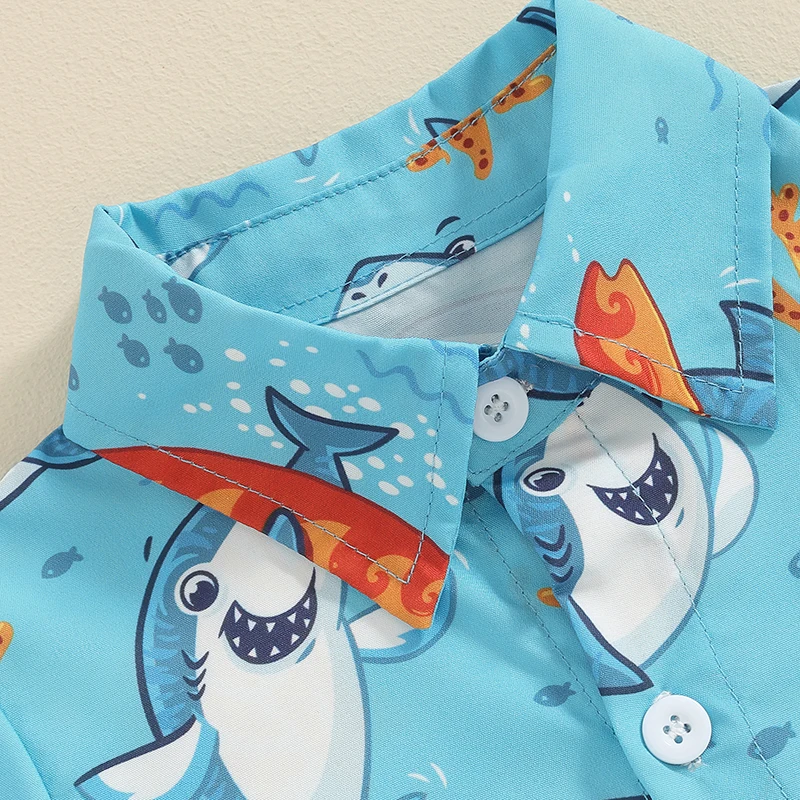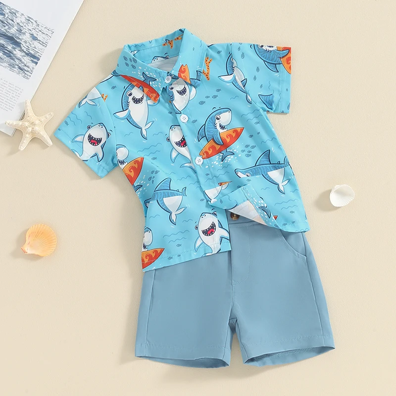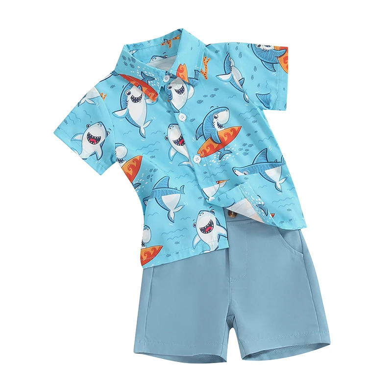 Детский летний комплект из рубашки и шортов с коротким рукавом и принтом акулы