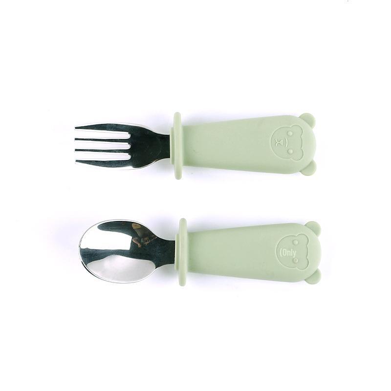 Детский набор вилок и ложек из нержавеющей стали 316L с силиконовыми ручками в виде мультяшного медведя для обучения ребенка еде