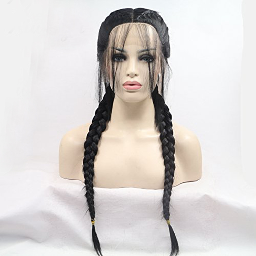 Middle Part Long Double Braids Straight Natural Black Purple Ombre Brown Braided Synthetic Light Brown Swiss Lace Front Wig With Baby Hair
