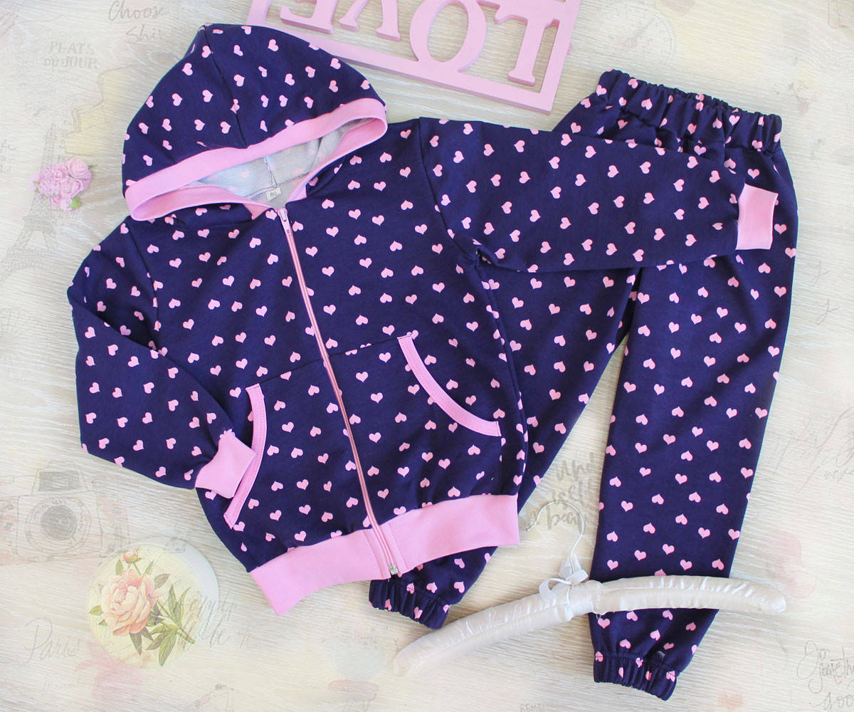 Этот очень красивый и по-девичьи милый костюм состоит из толстовки на молнии и брюк на манжетах. Пошит в интересном сочетании лилового полотна в розовые сердечки и отделки в тон сердечкам. Толстовка дополнена капюшоном и карманами.