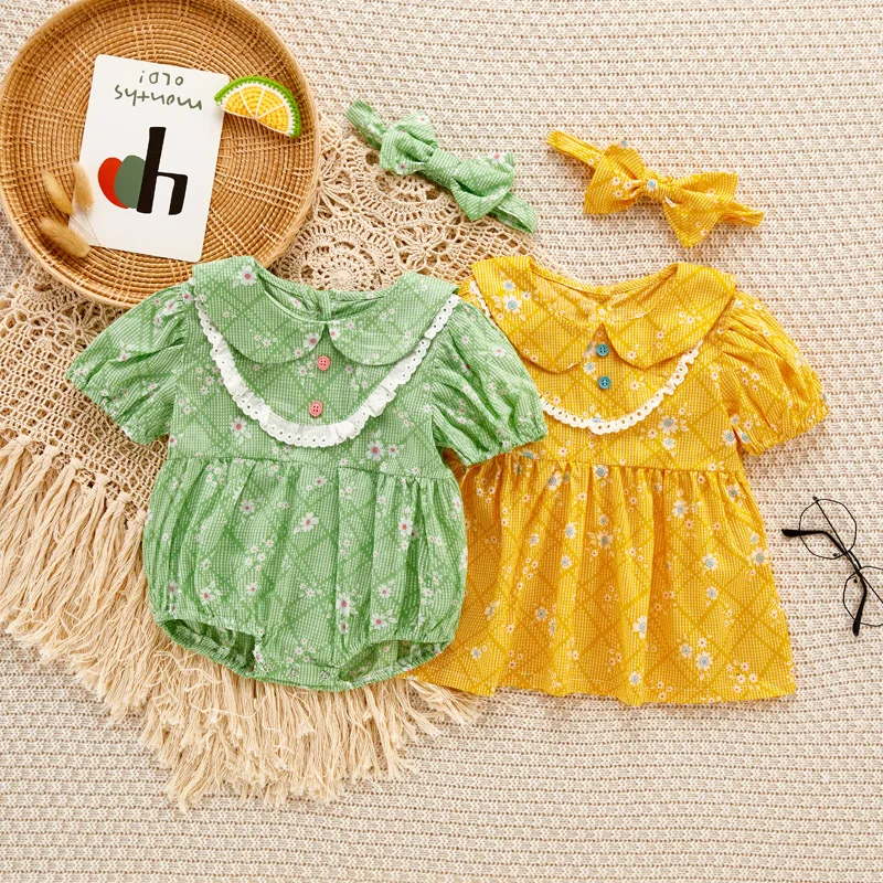 Детский хлопковый комбинезон с коротким рукавом, юбка с воротником «Питер Пэн» и цветочным принтом, платье для девочек в идиллическом стиле...