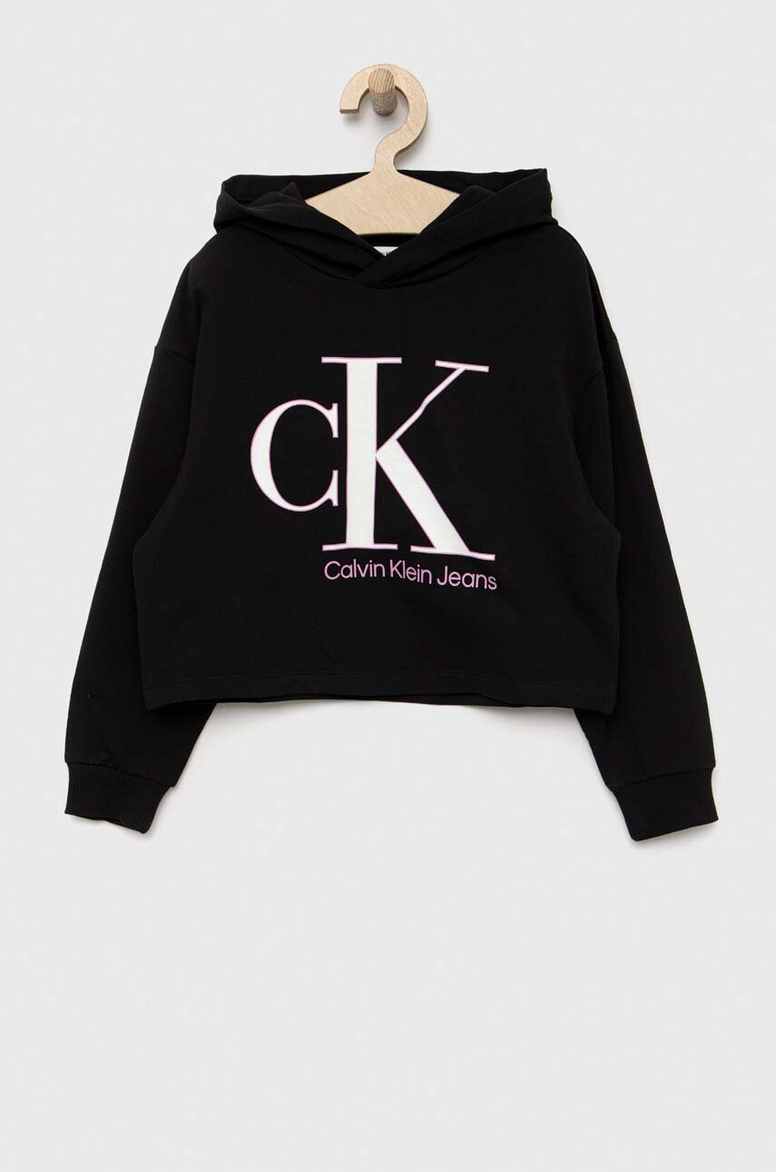 Детски суичър Calvin Klein Jeans в черно с качулка с принт, Черен