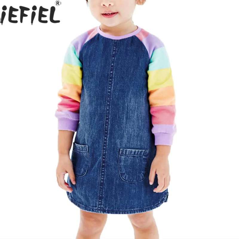 Детское джинсовое платье с длинными рукавами и карманами, в стиле пэчворк