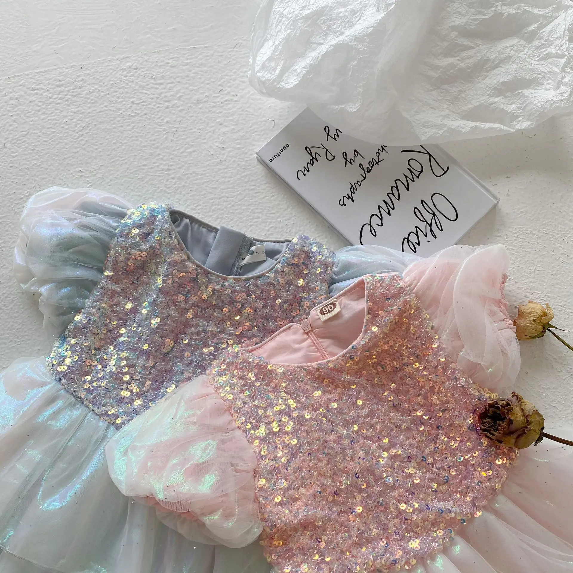 Детское платье в Корейском стиле, новинка 2024, летнее платье принцессы с градиентными блестками и юбкой-годе, платье для девочек