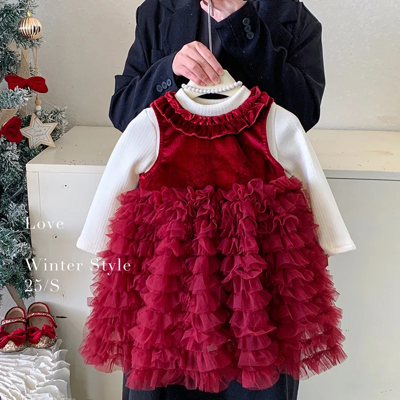 Детское платье из 2 предметов для маленьких девочек, новое зимнее бархатное сетчатое пышное платье для маленьких девочек + однотонная утепленная теплая майка для маленьких девочек, наряд