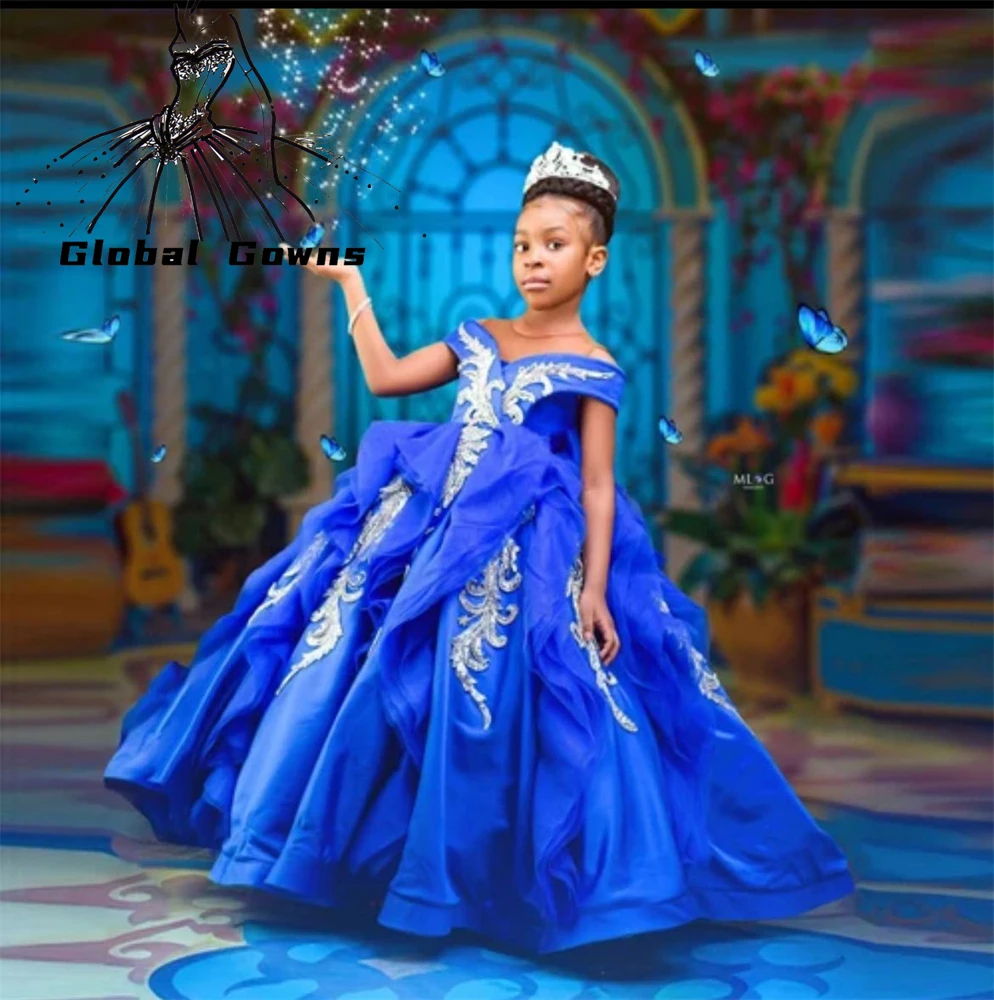 Детское платье с открытыми плечами, синее кружевное платье до пола, с аппликацией