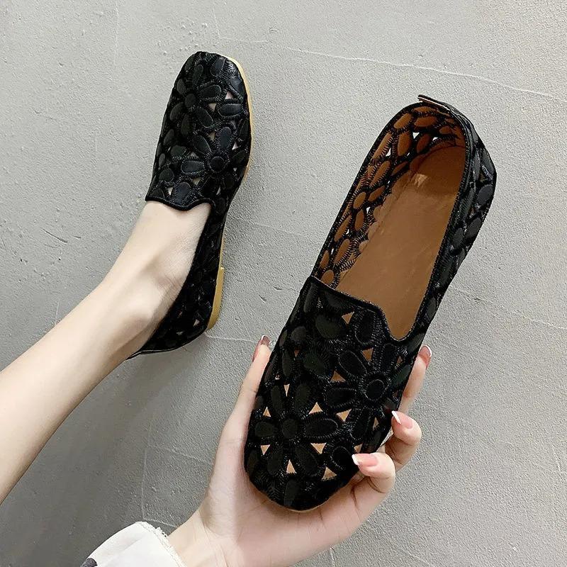 Дешевые летние вырезанные белые кожаные туфли женские дышащие балетки женские шикарные цветочные мокасины легкая обувь большой размер 42 CN 36 (230)