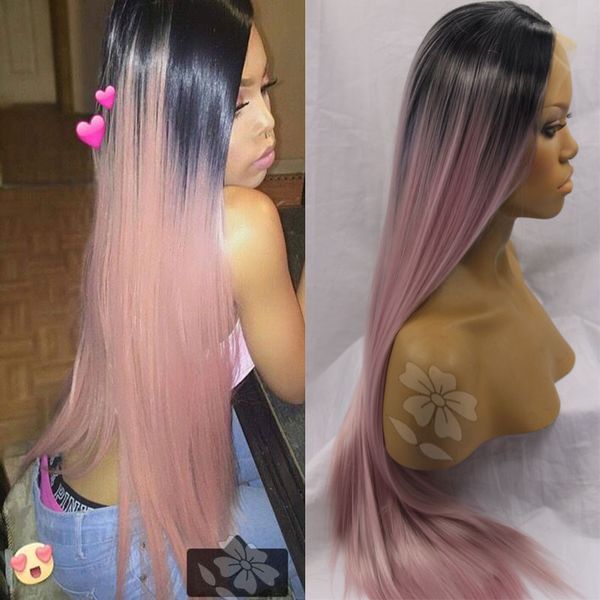 Дешевые Ombre Парики Два Тона Натуральный Черный Ombre Розовый Длинные Шелковистые Прямые Кружева Передние Парики Термостойкие Синтетические Кружева Перед Парик