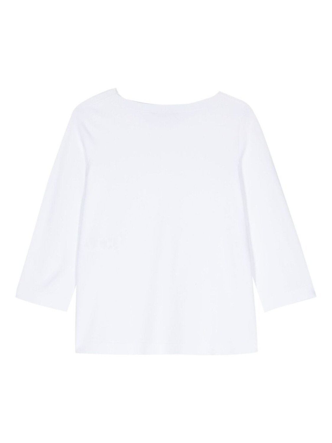Подробнее о товаре: • белый • ткань в мелкий рубчик • фактурная отделка • V-образный вырез • длинные рукава • подол и манжеты в рубчик