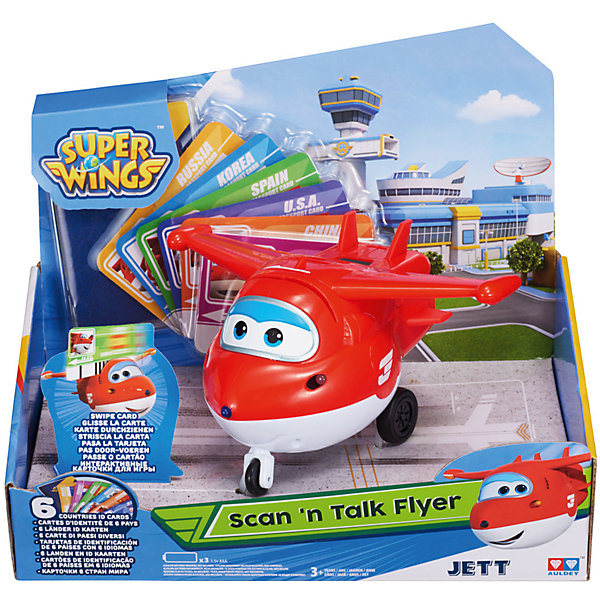Играть с самолетами любит практически каждый мальчишка. Сделать игру ярче и увлекательнее поможет Самолет Джетт. Это герой популярного мультфильма, любимого детьми. К нему прилагаются карточки, с помощью которых можно прослушать фразы Джетта на разных языках и выучить флаги стран. Отличный вариант для изучения иностранных языков и географии в игровой форме!