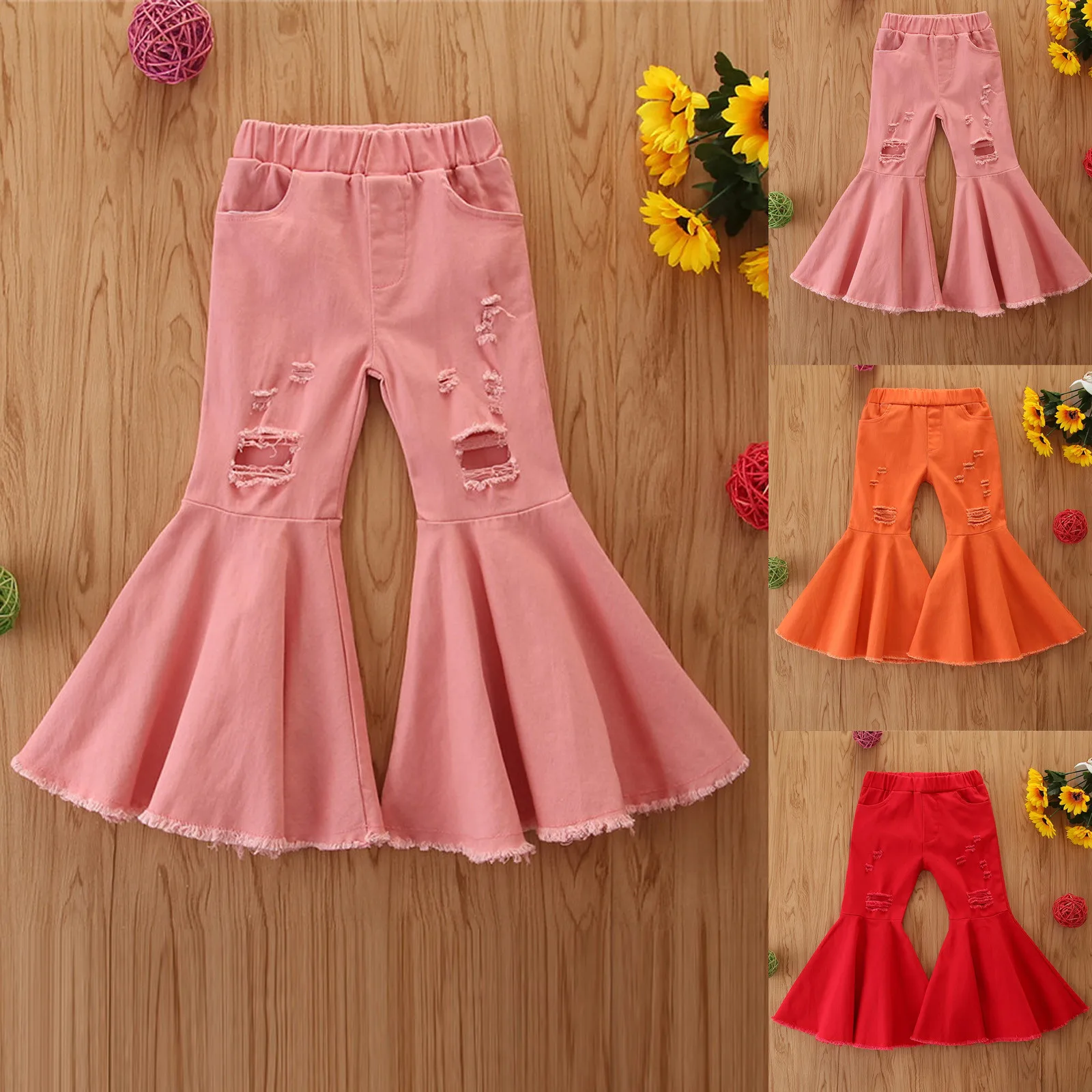 Джинсовые брюки для маленьких девочек, Облегающие расклешенные брюки с оборками, для детей, девочек