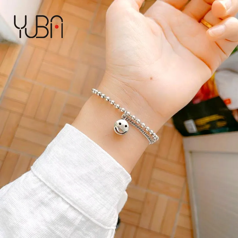 Exquisite 925 Silver Plated Layered Beaded Chain Smiling Face Bracelet Full Silver Tone Beads Linked Happy Face Bracelets