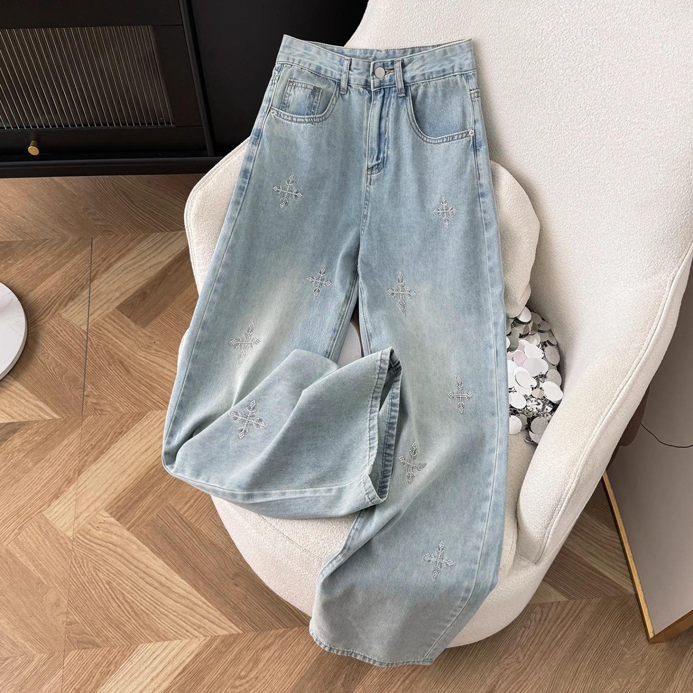 Джинсы деним 2025 Осень Высокий класс с высокой талией и эффектом похудения – Женские модные узкие прямые брюки с деталями из горячей стразы 2XL