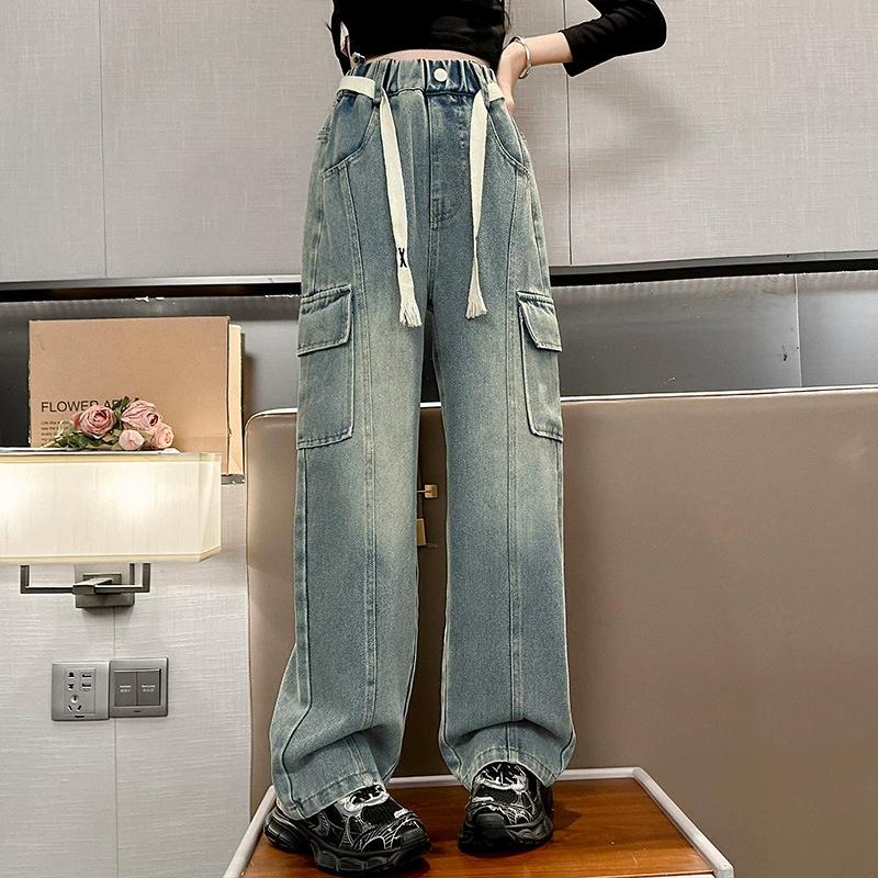 Джинсы для девочек, осенние, повседневные, свободные, градиентные, для маленьких детей, широкие брюки, для школьников 160 синий