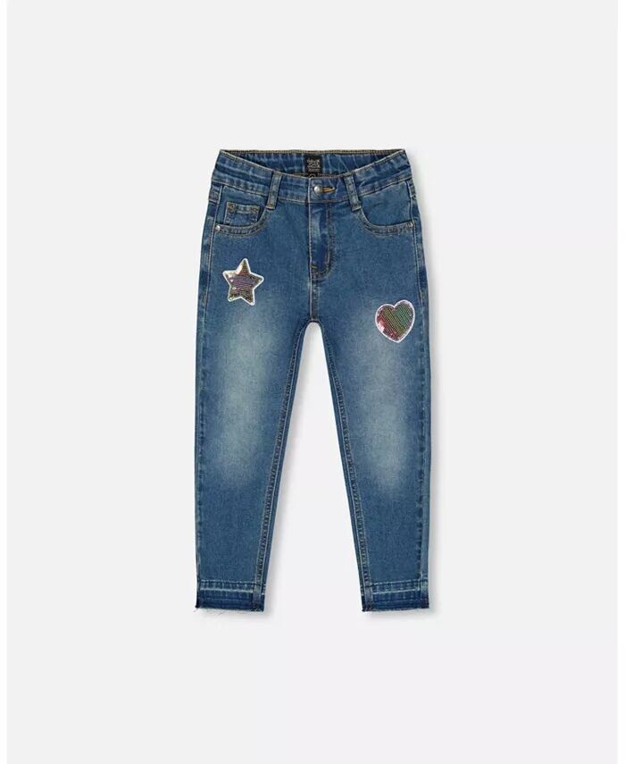 Металлизированные нашивки в виде сердечек и звезд придали цвет и блеск нашим джинсам с вышивкой из синего денима. Эти джинсы узкого кроя, изготовленные из эластичного хлопка и полиджинса, имеют овальные передние карманы, свободный низ и застежку на пуговицы на талии.