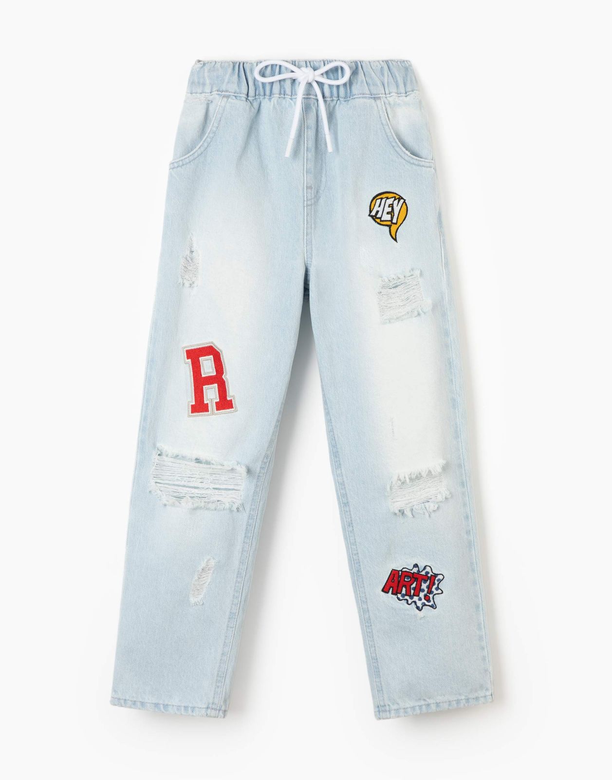 Рваная отделка, вышивка в колледж-стиле и просторный крой создают трендовый силуэт. Модель выполнена из премиального структурного денима из натурального хлопка.