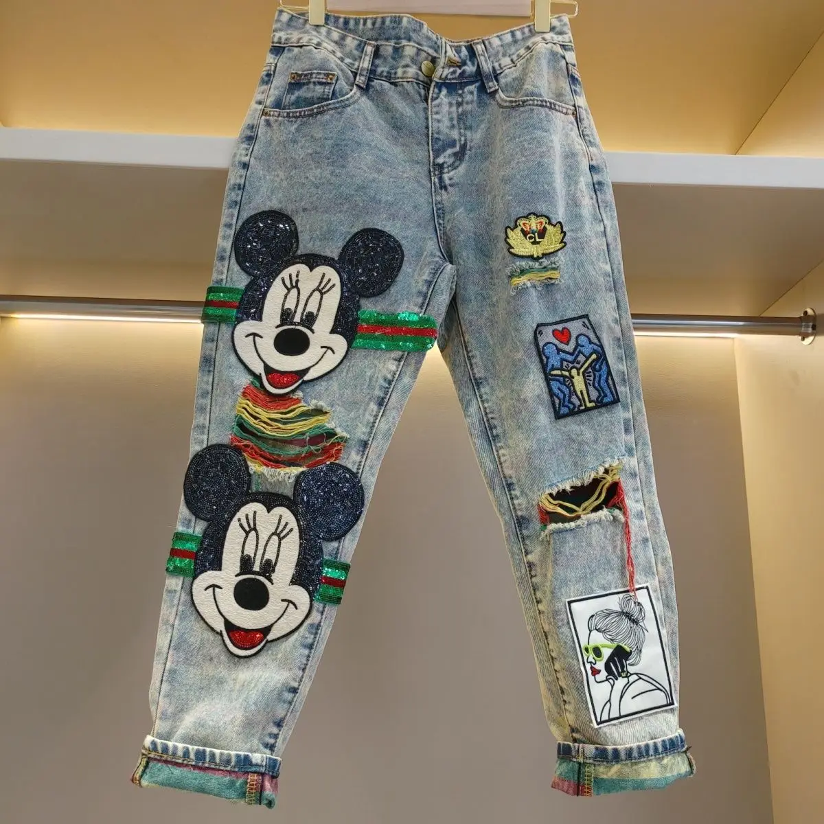 Джинсы женские длинные с высокой талией, винтажные ковбойские джинсовые штаны для подруг, с Микки Маусом, от Disney