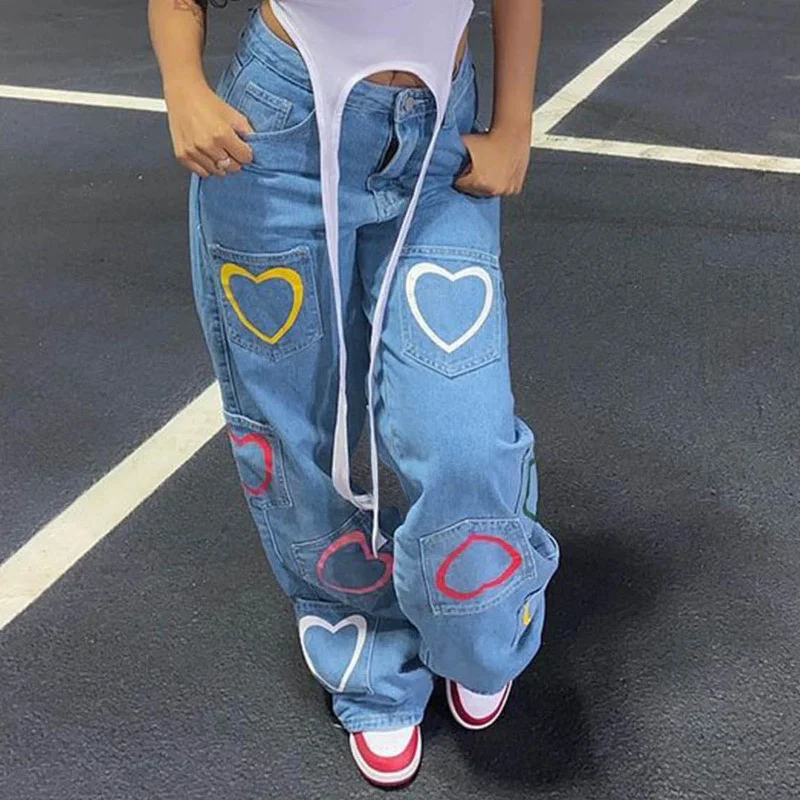 Джинсы женские свободные с принтом сердечек, повседневные брюки из денима с широкими штанинами, свободные джинсы в стиле ретро с графическим принтом, Y2k