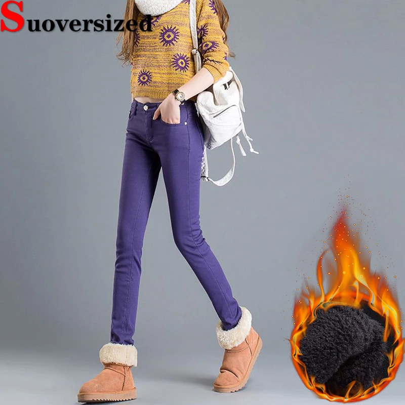 Джинсы-карандаш женские зимние эластичные с высокой талией и плюшевой подкладкой