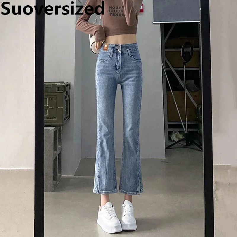 Джинсы-клеш Женские до щиколотки, модные облегающие брюки-клеш с высокой талией, с разрезом, уличная одежда в Корейском стиле, весна-осень