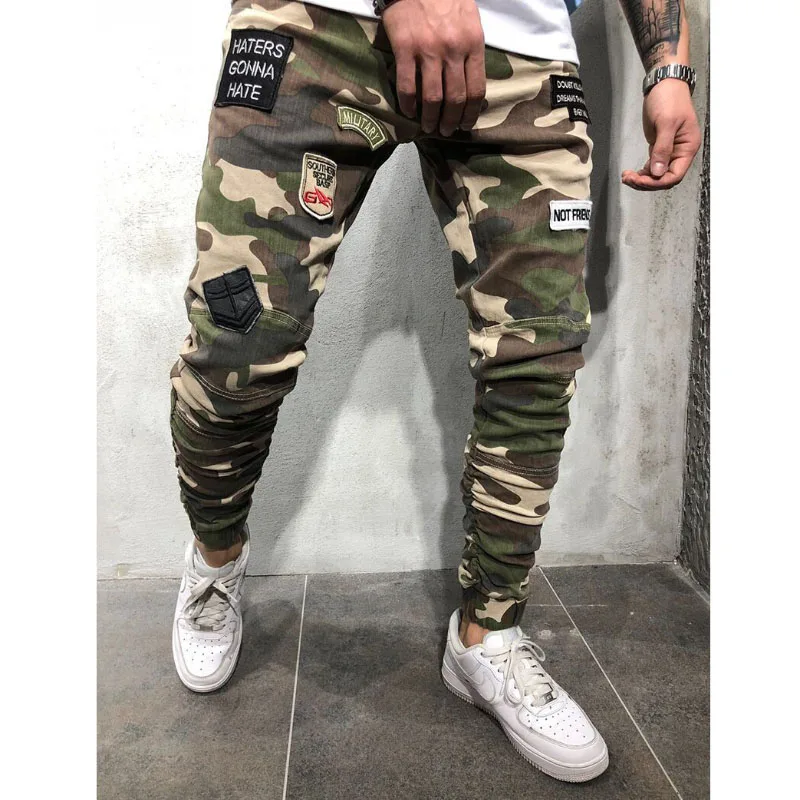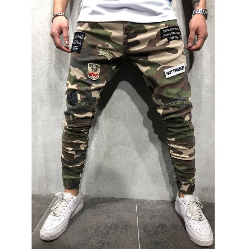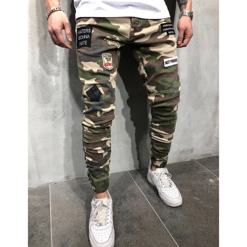 Джинсы мужские облегающие, эластичные штаны, камуфляжные брюки скинни, значок, стрейч