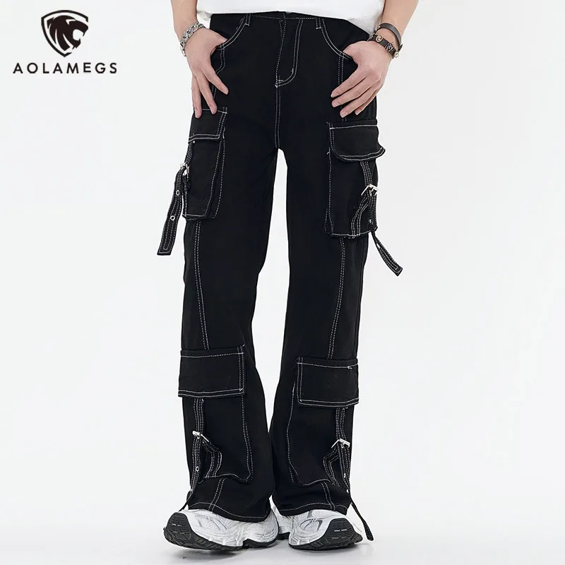 Джинсы мужские с завышенной талией, мешковатые прямые брюки с множеством карманов, универсальные черные нейтральные Широкие штаны в стиле Харадзюку, в американском стиле
