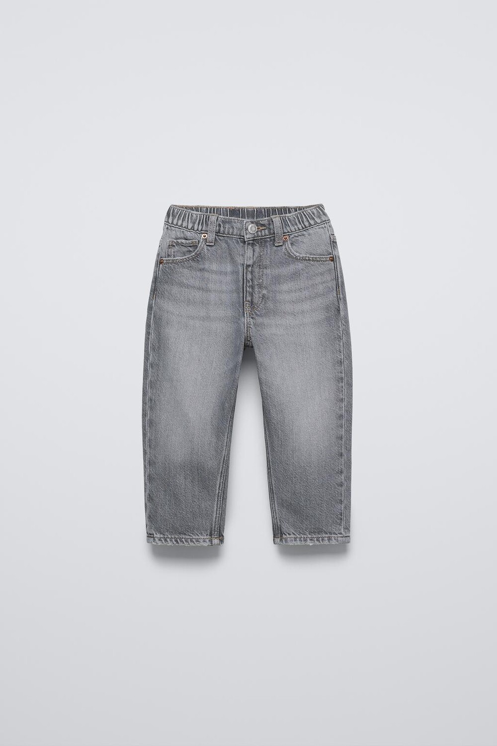 Джинсы оригинального кроя с эластичным поясом и застежкой на пуговицы спереди. Передние карманы и накладные карманы сзади.