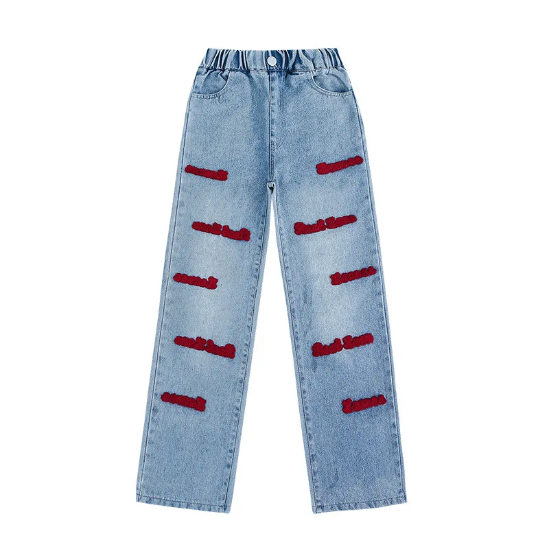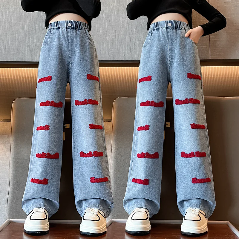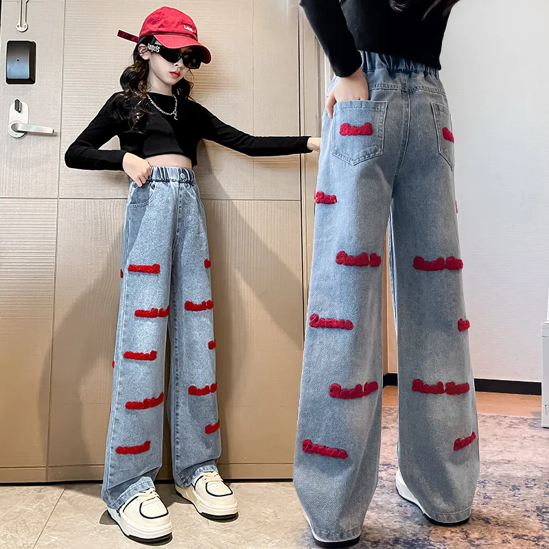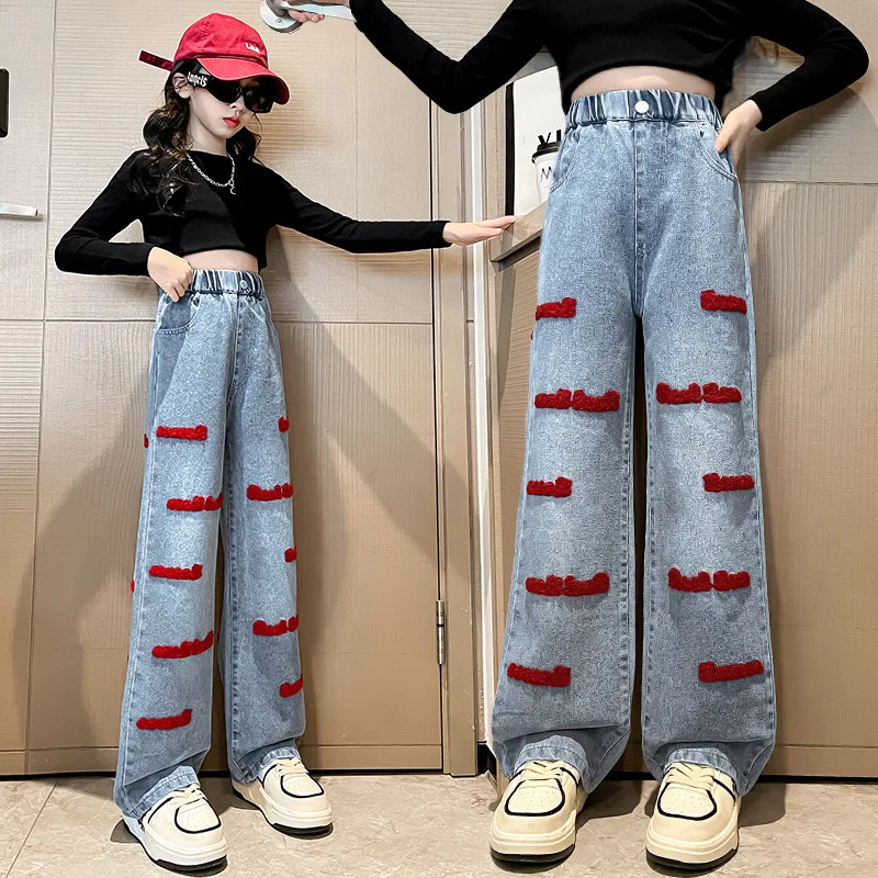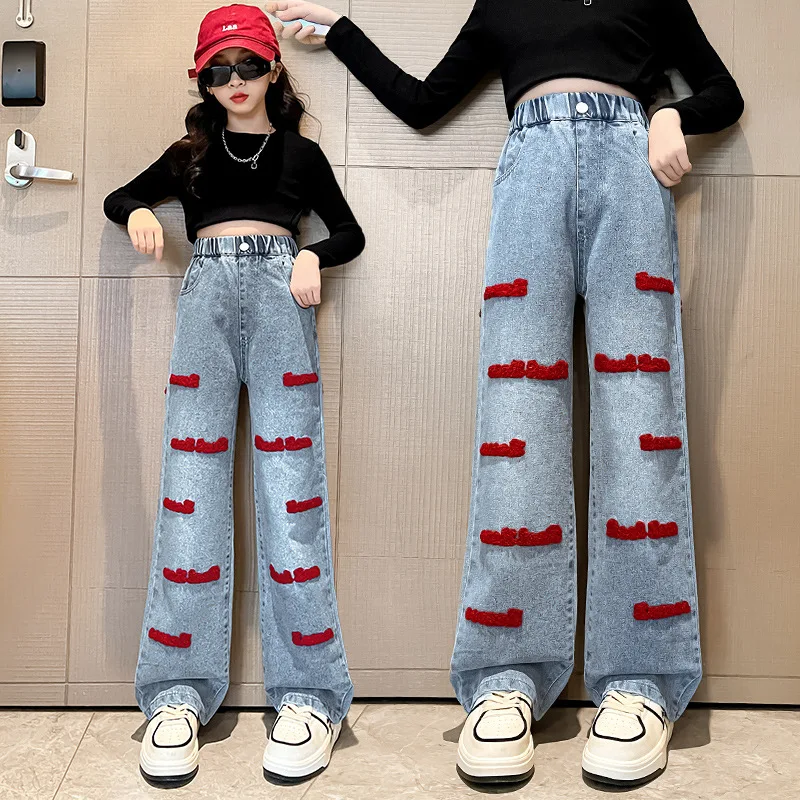 Джинсы с вышивкой для девочек, широкие брюки из денима, повседневная одежда для детей 6, 8, 10, 12, 14 лет, на весну