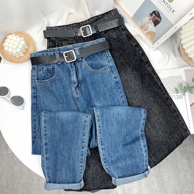 Джинсы с завышенной талией весна-осень 2022 женские темно-синие базовые универсальные Свободные повседневные Прямые шаровары