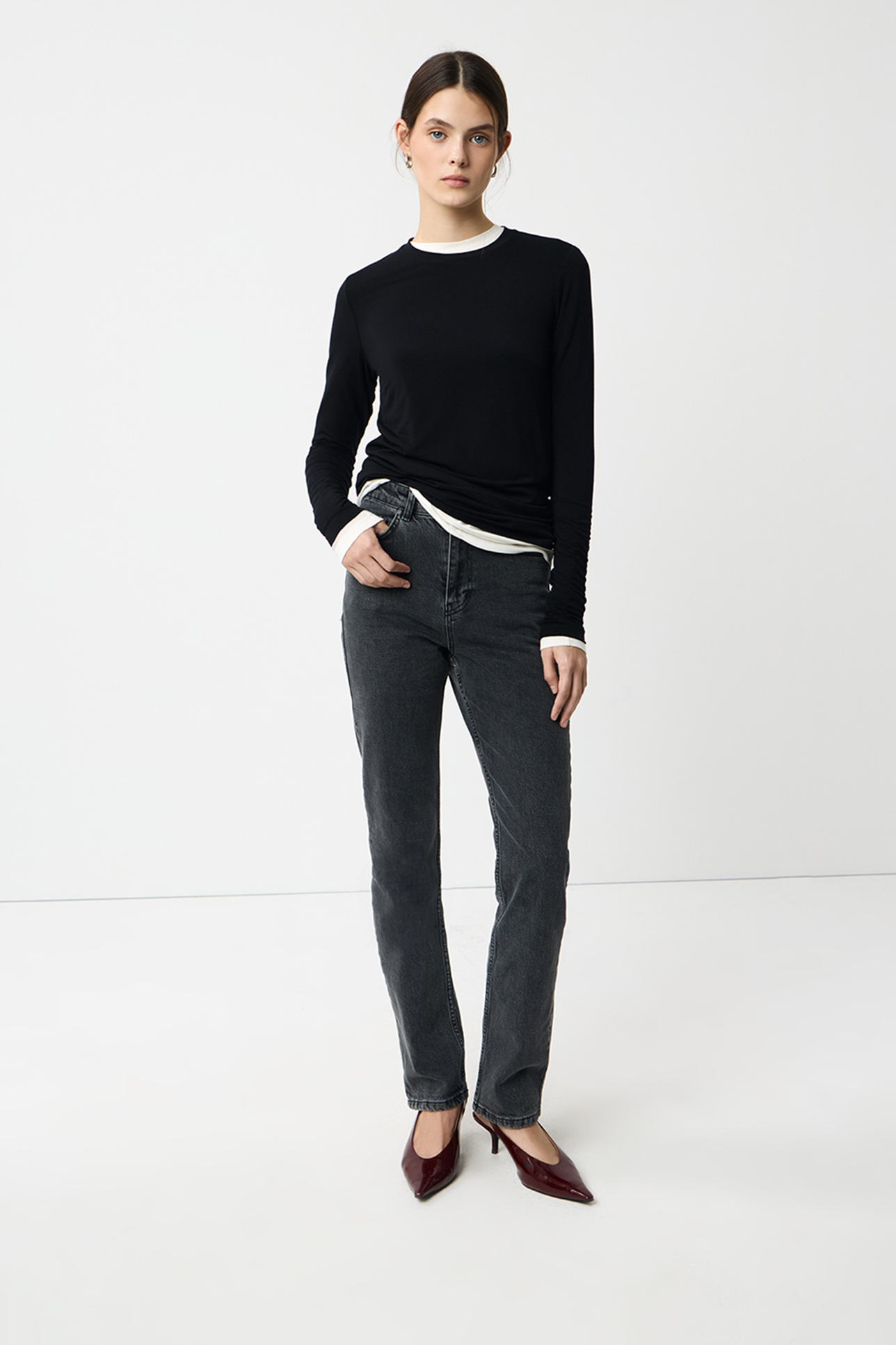 Джинсы на высокой посадке, прямого узкого кроя. Трендовая модель осеннего сезона.