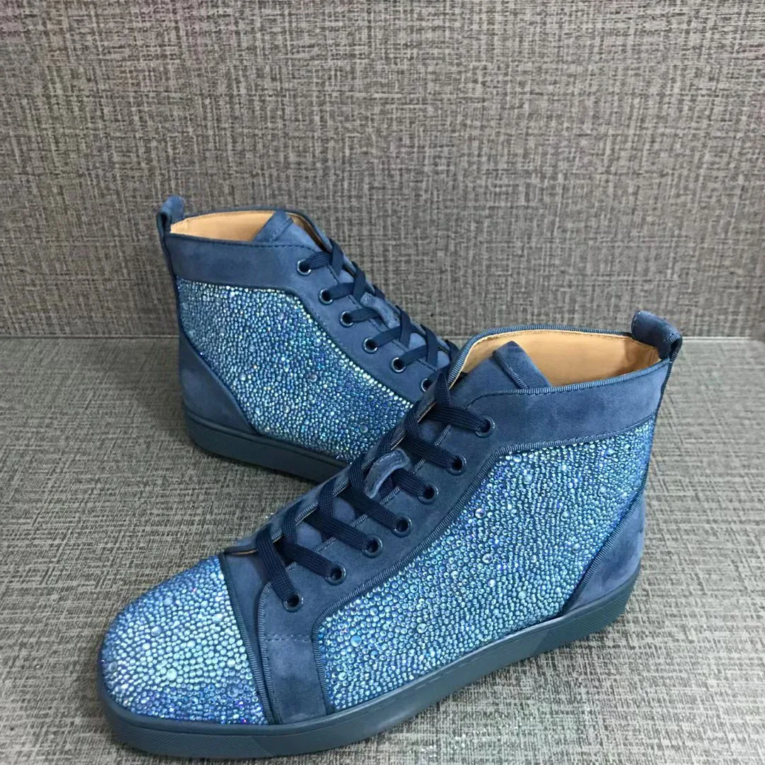 Дизайнерские высокие мужские кроссовки для пар, обувь для вождения с шипами из синей замши и натуральной кожи со стразами для свадьбы