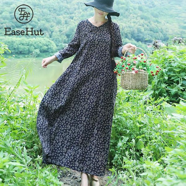 2021 new aurumn cotton linen maxi dress long sleeve v-neck button printed dress vintage robe vestido female long dresses, Black;gray