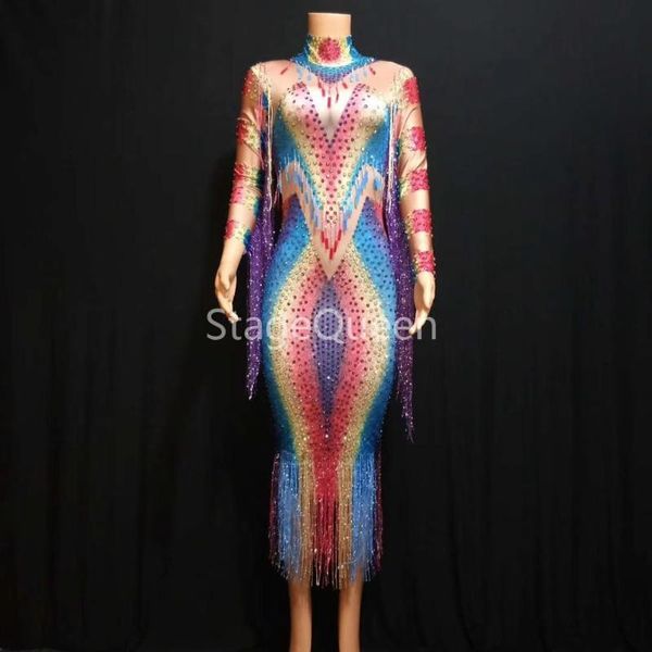 casual dresses colorful tassel rhinestone dress women's evening party wear luxurious stretch prom birthday celebrate female singer, Black;gray