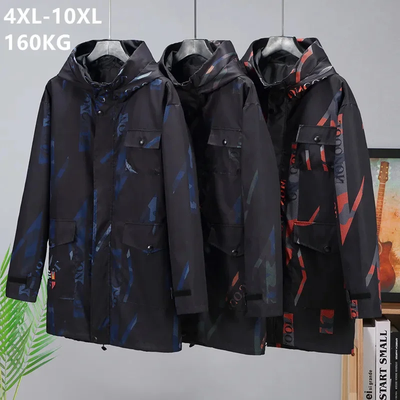 Длинная Мужская ветровка, свободный Тренч, черная ветровка с капюшоном, Карго, размеры 10XL 9XL 8XL, весна 7XL