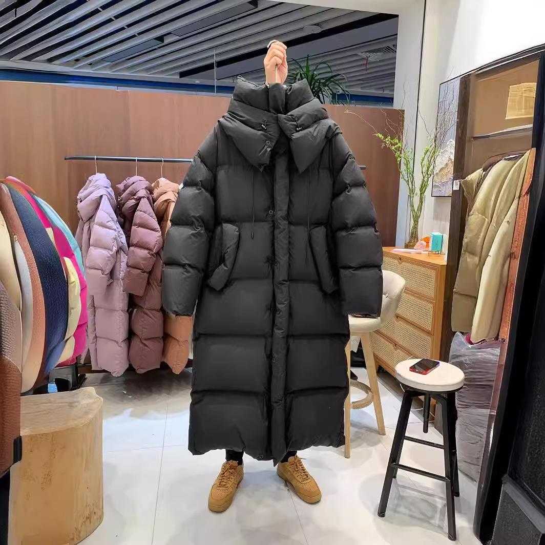 Длинная куртка-пуховик с капюшоном выше колена для женщин в стиле ретро 2024 года, зимняя новая корейская версия, свободная большая стеганая белая куртка-пуховик на утином пуху M чёрный